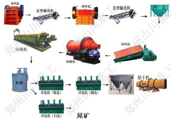 硫化物(螢石類(lèi)礦石):原礦破碎->球磨機(jī)磨礦->優(yōu)先浮選硫化礦物->尾礦浮選螢石->螢石粗精礦多次精選。